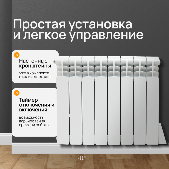 Климат-контроль: Задайте желаемую температуру воздуха в диапазоне от +5 до +35°С, и радиатор автоматически будет поддерживать ее, включаясь и выключаясь по мере необходимости.