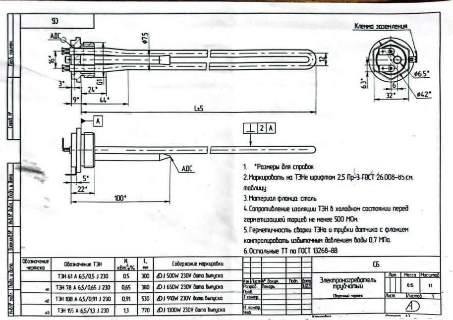 Чертеж ТЭНа для радиаторов, регистров, чугунных батарей