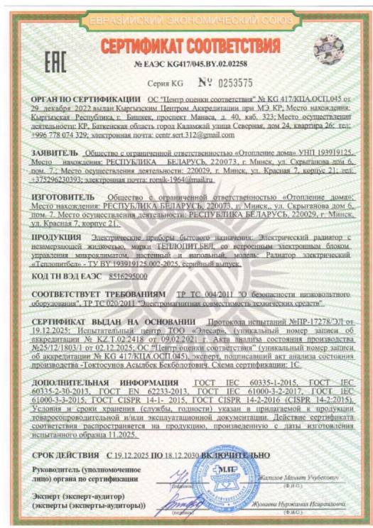 Наименование и адрес изготовителя : ООО “Отопление дома”, Республика Беларусь, 220073, г. Минск, ул. Скрыганова 6, ком. 7.